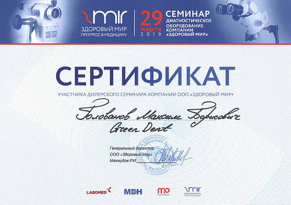 Сервис инженер компании «ГРИН ДЕНТ», Голованов Максим Борисович, успешно прошел тренинг по ремонту и обслуживанию оборудования Labomed, Medpribor, MDH и Здоровый мир.