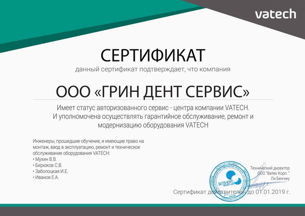 ООО «ГРИН ДЕНТ СЕРВИС» имеет статус авторизованного сервиса-центра компании VATECH и уполномочена осуществлять гарантийное обслуживание, ремонт и модернизацию оборудования VATECH.