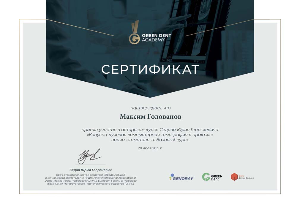Сертификат подтверждает, что Максим Голованов принял участие в авторском курсе Седова Юрия Георгиевича «Конусно-лучевая компьютерная томография в практике врача-стоматолога. Базовый курс»